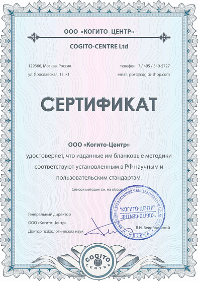 - Сертификат соответствия бланковых методик, изданных "Когито-Центром", установленным в РФ научным и пользовательским стандартам - 1 шт.