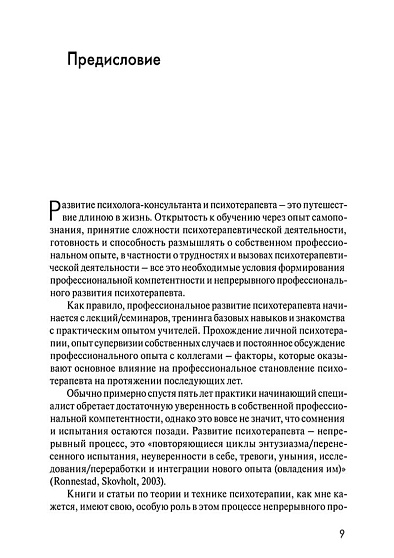 Пошаговый анализ процесса терапевтической коммуникации — это непременная составляющая тренинга профессиональных навыков и супервизии случаев, поэтому я надеюсь, что представленная в этой главе типология вербальных вмешательств может быть использована в качестве своего рода мини-руководства по применению базовых техник в процессе обучения психологов-консультантов и психотерапевтов.