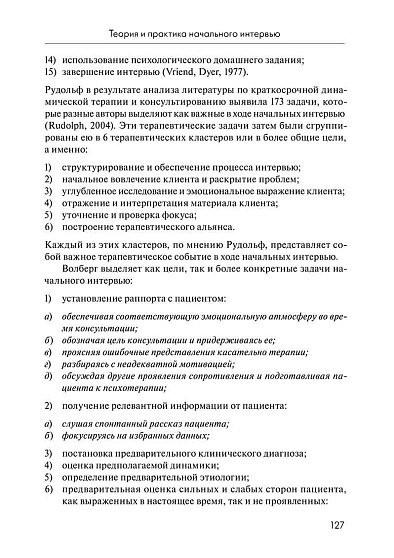 • исследование ожиданий относительно помощи («Как вы думаете, что будет происходить в течение этой встречи?», «Какие чувства вы испытываете в связи с приходом на сеансы?»);