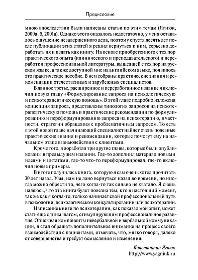 Книги, подобные этой, читают и перечитывают с карандашом в руке. Перед вами – третье, переработанное и дополненное издание учебного пособия, в котором собраны практические знания и рекомендации отечественных и зарубежных специалистов, систематически описаны базовые навыки и техники психологического консультирования и психотерапии. В книге подробно рассмотрены следующие темы: невербальные аспекты взаимодействия терапевта и пациента, типология вербальных вмешательств, техника и практика проведения начальной консультации, а также формулирование и переформулирование запроса на психотерапевтическую помощь. В практикуме предлагаются задания, которые могут быть использованы в процессе обучения психологическому консультированию и психотерапии, а также для самостоятельного овладения техниками терапевтической коммуникации.Содержание
