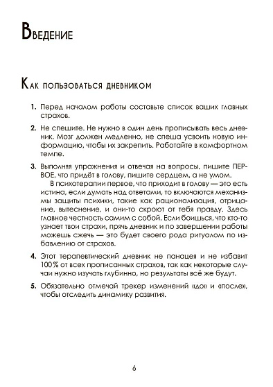 В основе дневника лежит синтез проверенных терапевтических подходов: когнитивно-поведенческой терапии (КПТ), психоанализа, гештальт- и арт-терапии. Каждый из 30 дней — это новый шаг на пути от осознания своих страхов через исследование и изменение отношения к ним к принятию и решительным действиям.