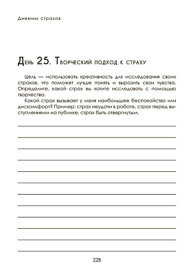 Вас ждут упражнения на самонаблюдение, челленджи негативных установок, техники глубокого дыхания, визуализации и арт-терапии. Вы научитесь не бежать от страха, а встречаться с ним лицом к лицу, понимать его природу и, наконец, лишать его власти над собой.