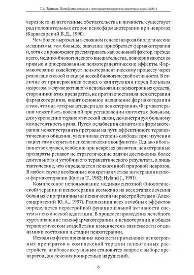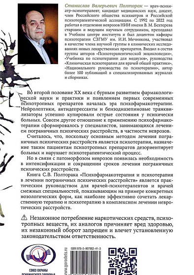 Книга С. В. Полторака "Психофармакотерапия и психотерапия в лечении пограничных психических расстройств" является практическим руководством для врачей-психотерапевтов и врачей смежных специальностей, показывающим на примере конкретных нозологических форм, как наиболее эффективно сочетать лекарственную терапию и психотерапию в комплексном лечении невротических расстройств.